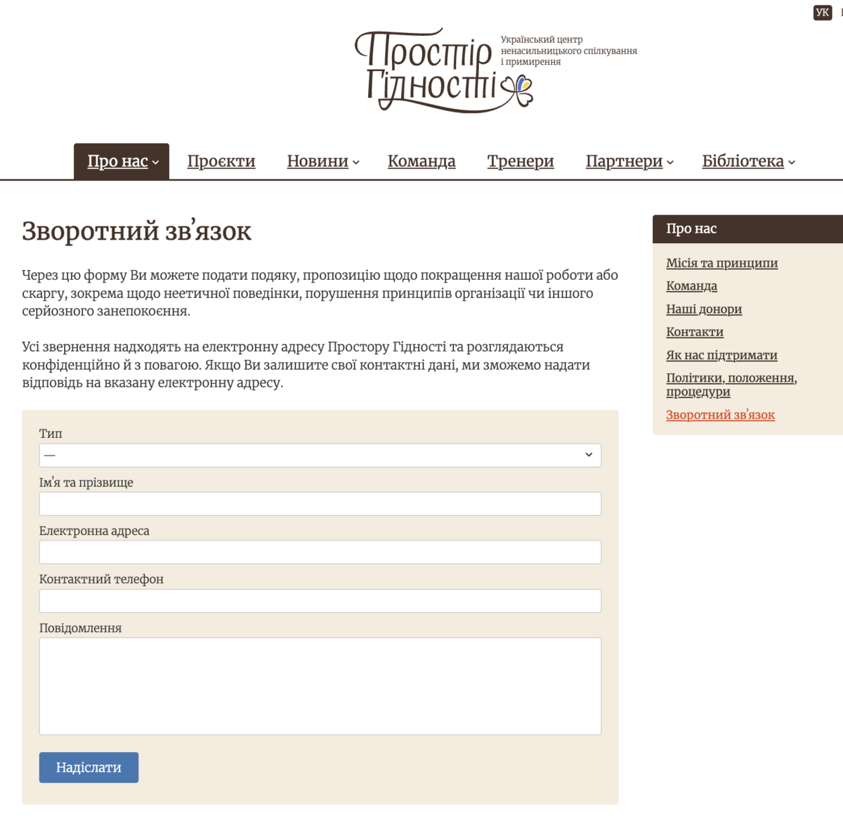 На сторінці Простору Гідності тепер доступна форма зворотного зв’язку. Через форму можна подати відгук, подяку, пропозицію або скаргу, зокрема у випадках, що стосуються неетичної поведінки, порушення принципів організації чи іншого серйозного занепокоєння.